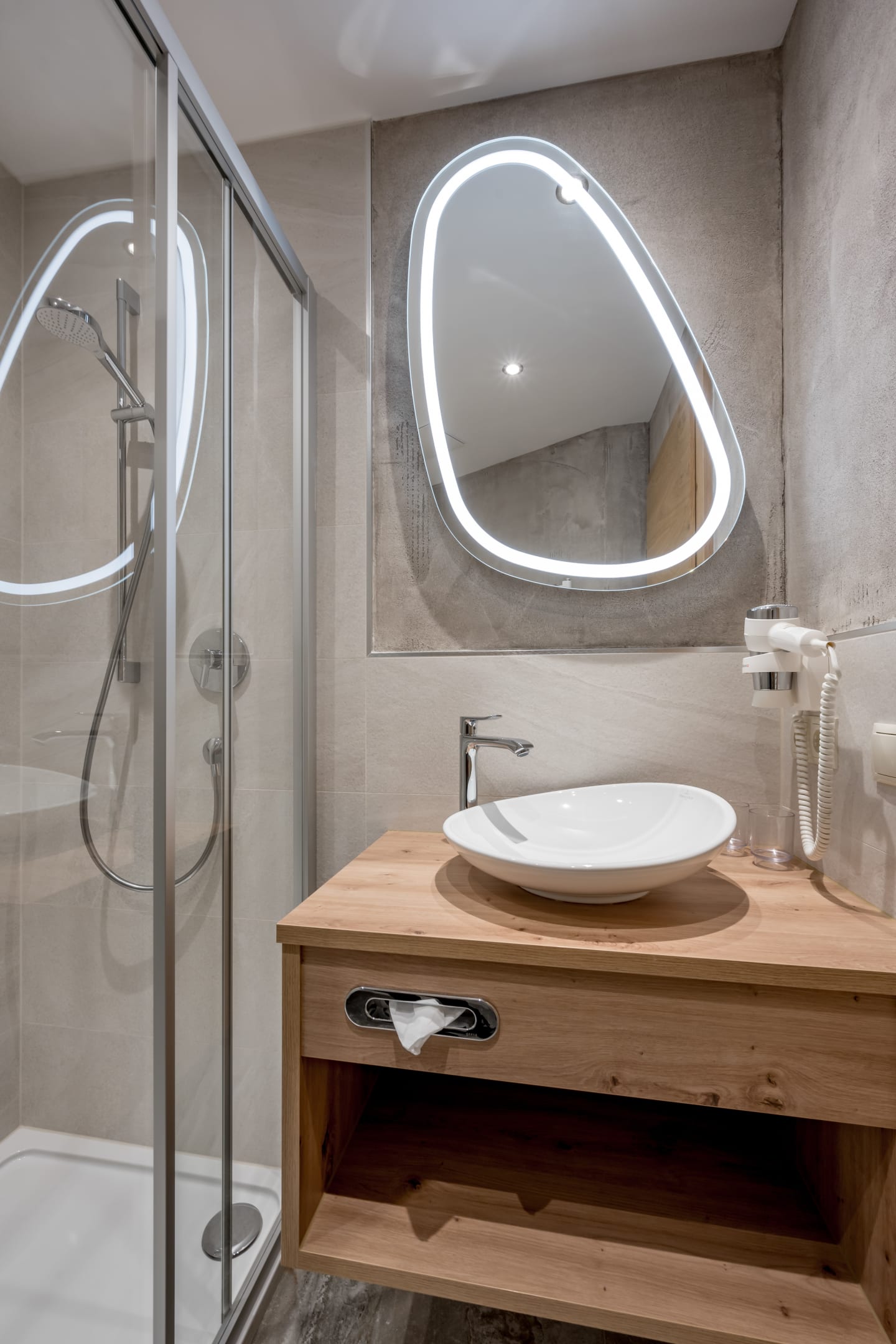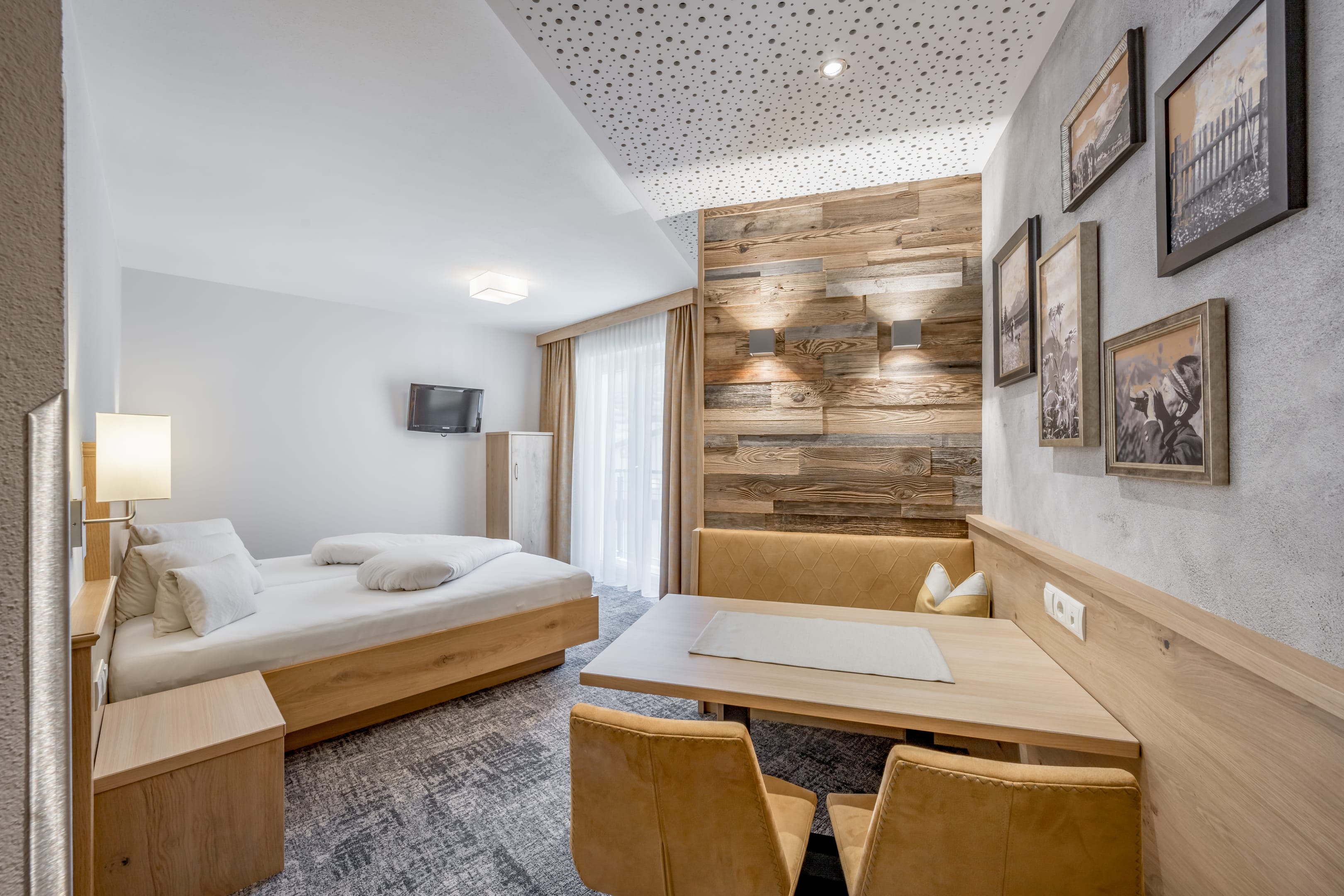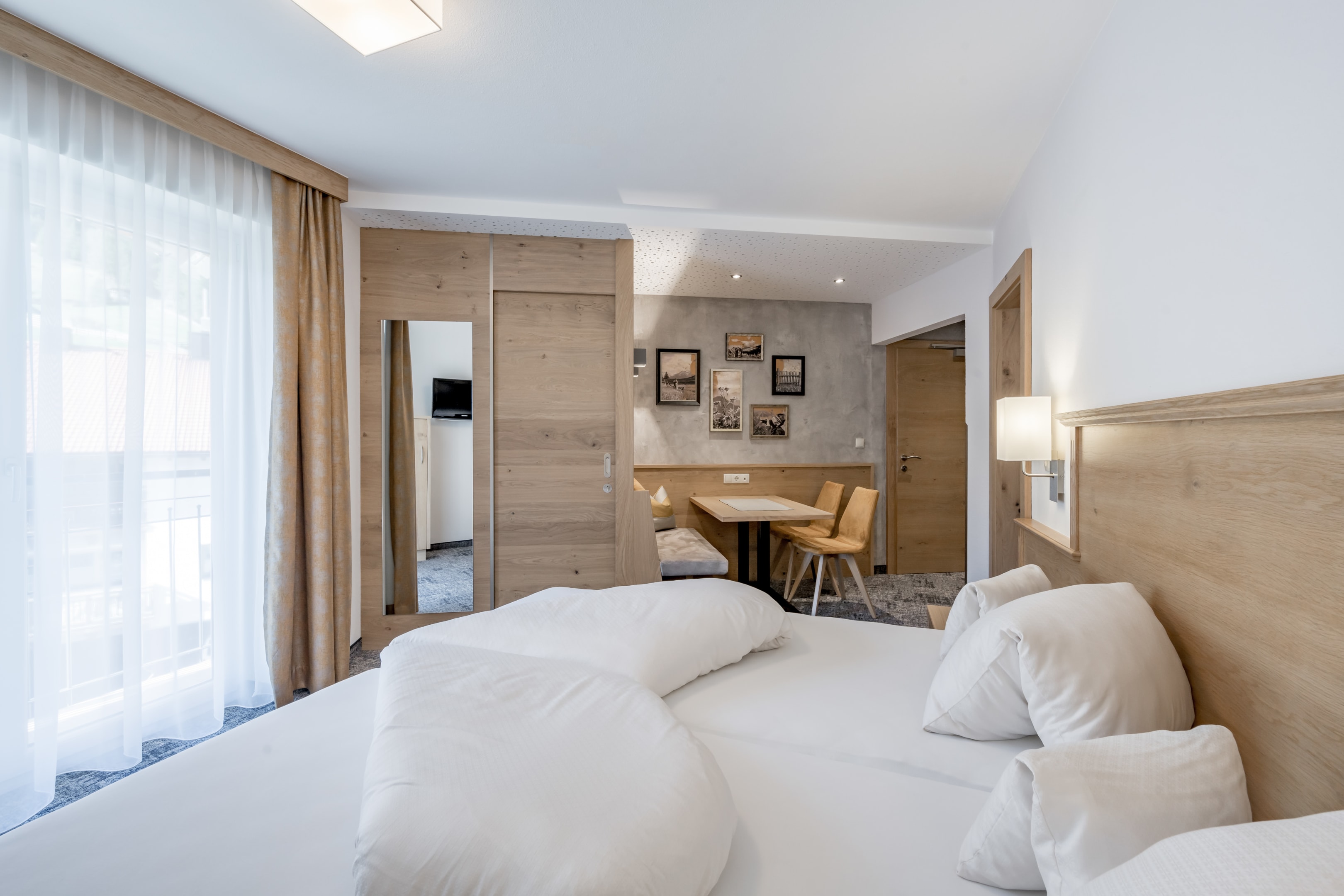 jedes Zimmer mit DU/WC, Fön, beheizter Handtuchhalter, Safe, Flat-TV, gratis WLAN, gemütlicher Sitzbereich, jedes Zimmer mit kleinem franz. Balkonvorsprung und traumhaftem Panorama-Bergblick, Vorraum/Schrankraum;